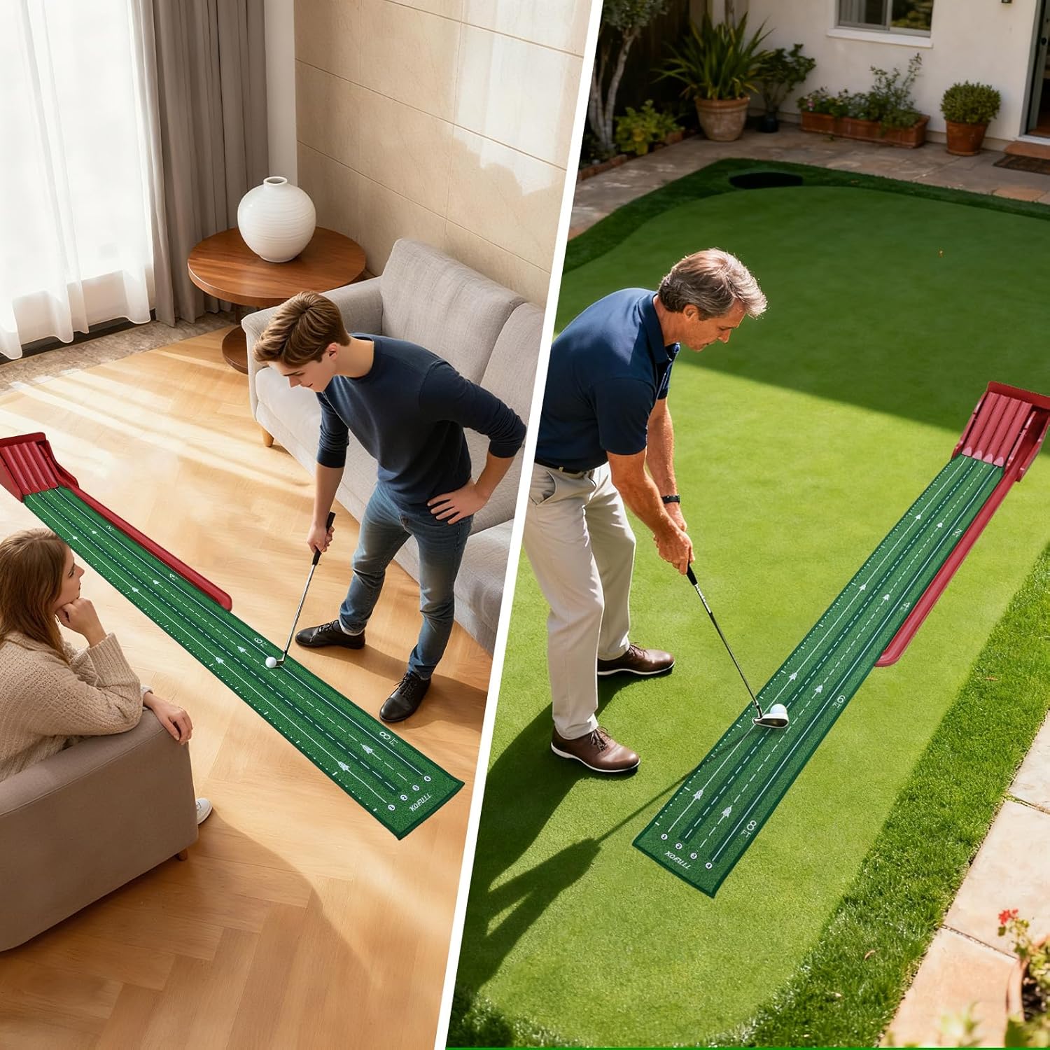 - 【Putting Green with Effortless Ball Return System】Our putting mat can save your golf practice time. Ball-return system can automatically return the ball after each stroke. With four tracks design, which simulates the design of the golf course's ramp, you can play with friends, set rules, and keep scores—making it an exciting social backyard golf game or funny golf practice.