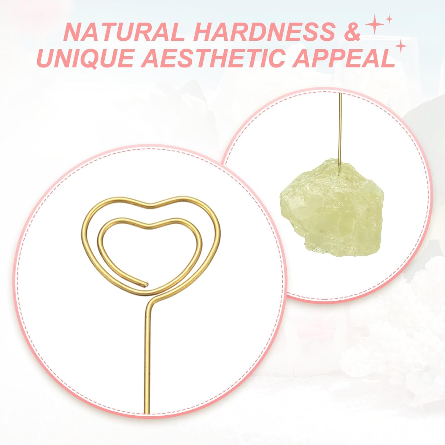 - Advantage: Crystal Stone Desk Card Holder features a genuine quartz base, known for its natural hardness and unique aesthetic appeal. The base provides stable support for various display needs. The desk card holder is fitted with an elegantly designed iron clip that firmly grips photos, memos, and cards.