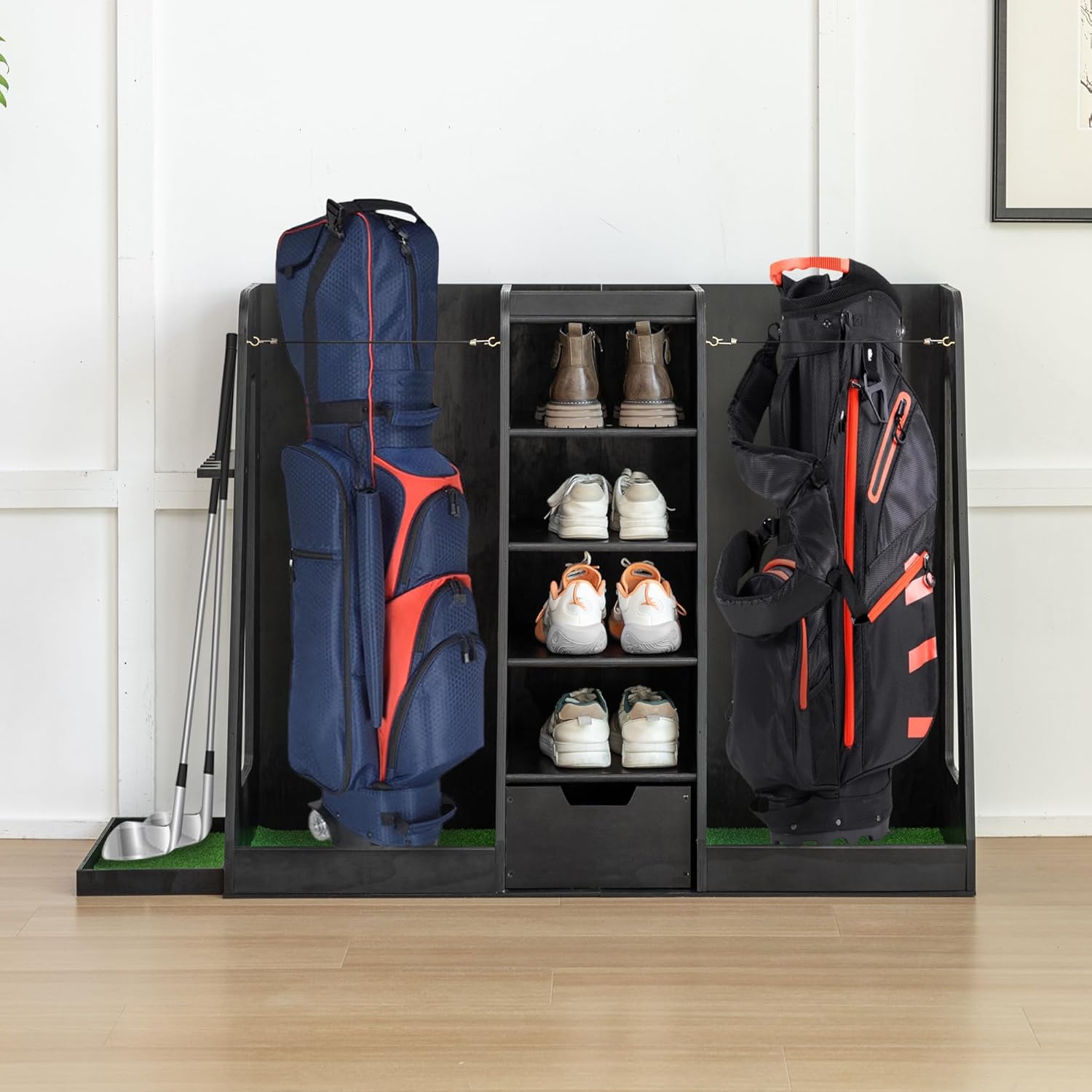 - Large Storage Capacity : Overall size: 55.5" L × 16.00" W × 37" H. This wooden golf bag organizer holds 2 golf bags, multiple clubs, 5 pairs of shoes, and essential accessories. A built-in dust-proof drawer stores clean clothes or hundreds of golf balls.