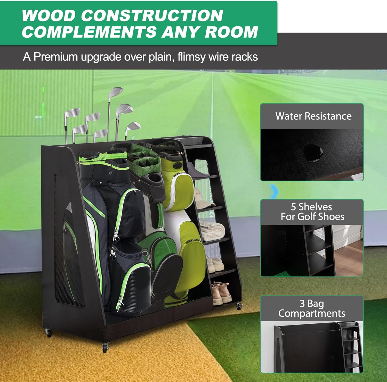 Wooden Golf Bag Organizer Garage Large Golf Bag Storage Rack Stand with Wheels Fits 3 Golf Bags, Golf Clubs and Other Golfing Equipment Accessories Golf Bag Holder for Garage, Club, Shed Basement