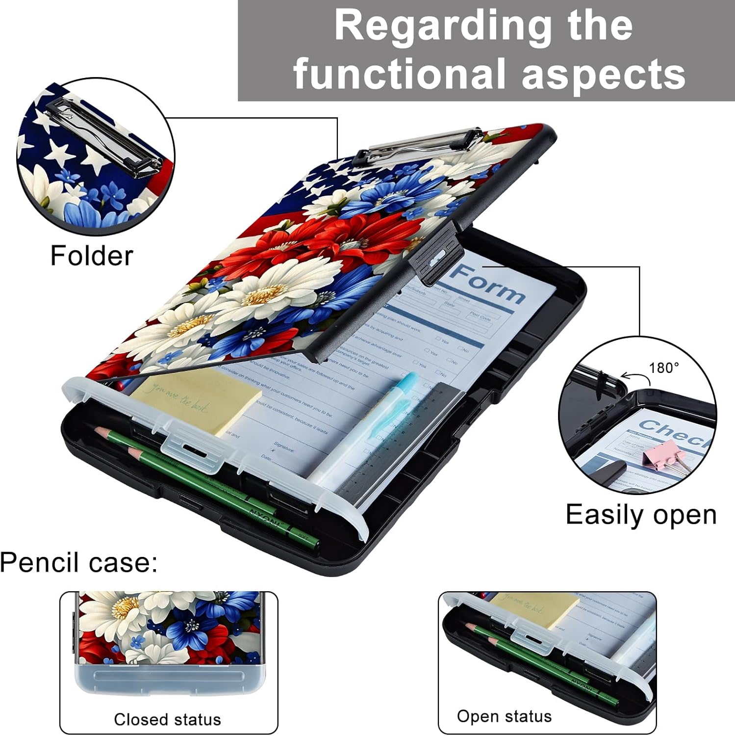 Clipboard with Storage - Large Capacity,Nursing Clipboard with Pen Holder,Heavy Duty,Plastic Side-Opening Folder for Teacher,Nurse - American Flag Flowers Bouquet