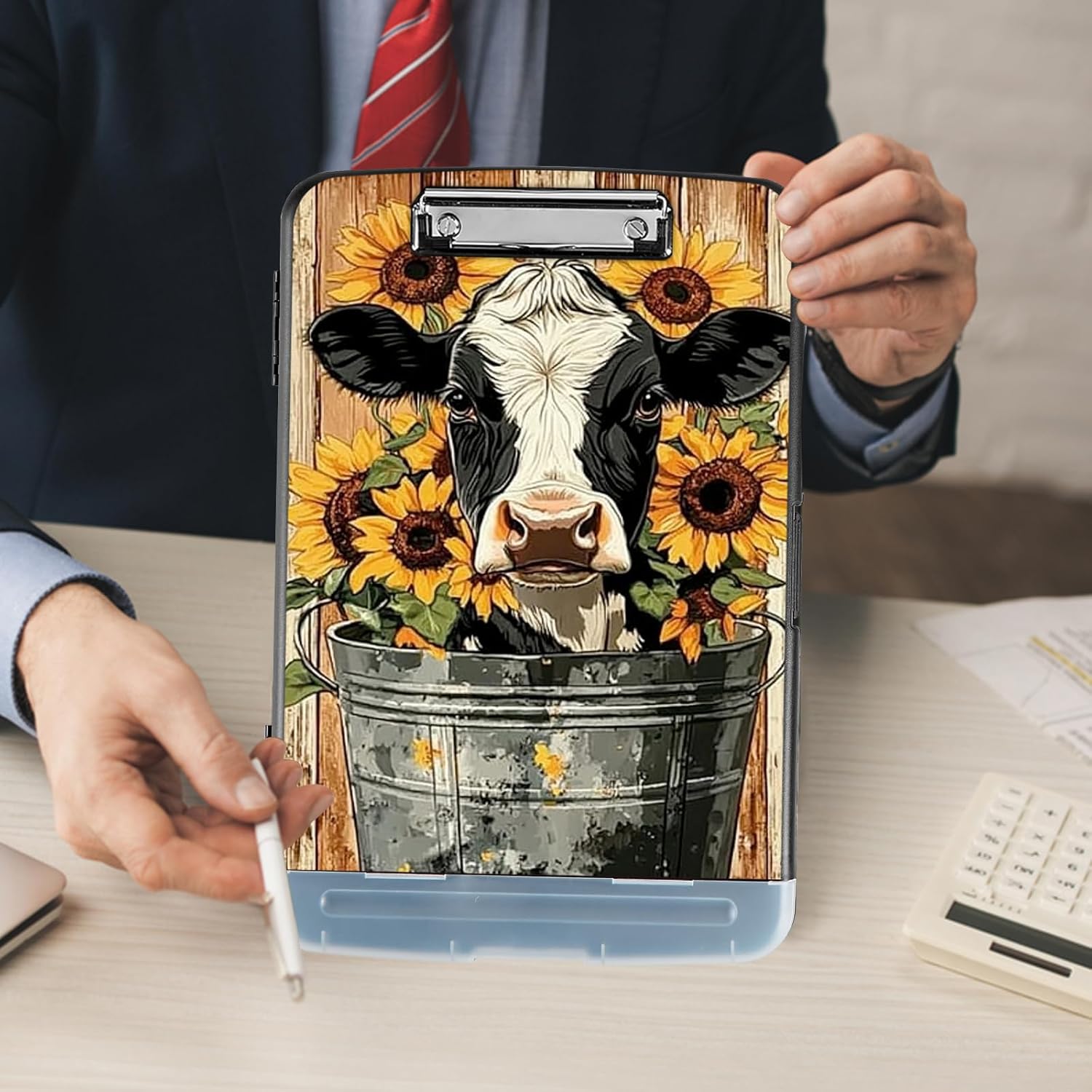Clipboard with Storage - Large Capacity,Nursing Clipboard with Pen Holder,Heavy Duty,Plastic Side-Opening Folder for Teacher,Nurse - Cow Sunflower