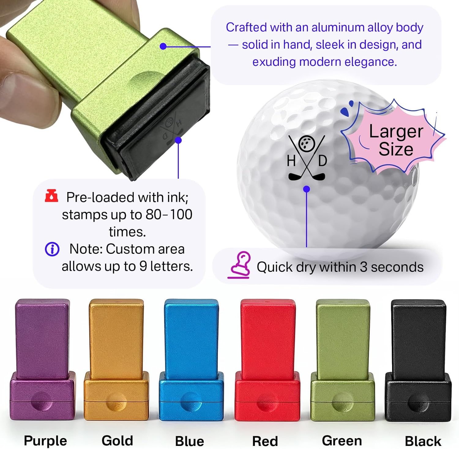 - Multiple Color Choices: 6 stamp case colors (Purple/Gold/Blue/Red/Green/Black) and 5 ink colors (Blue/Red/Purple/Green/Black) to match your style.